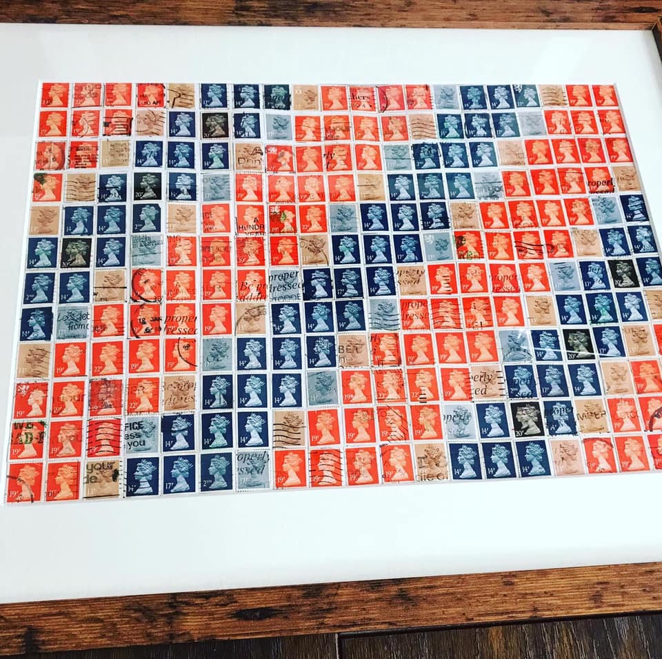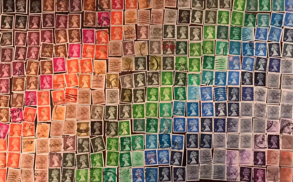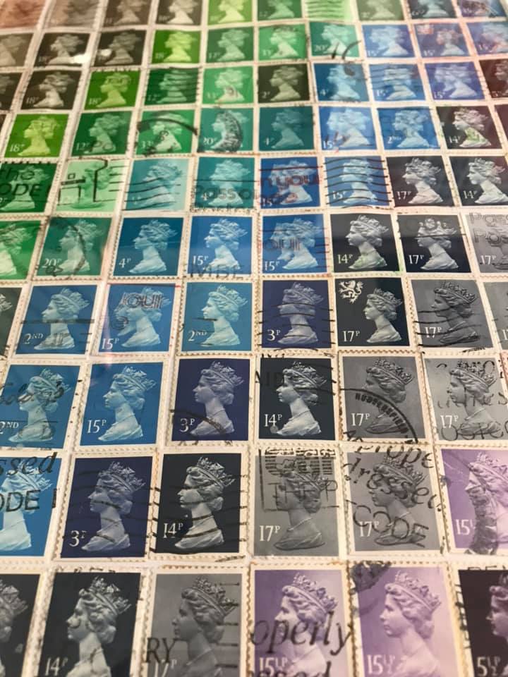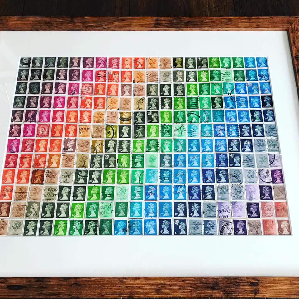 Stamp collection sorted by colourArranged in diagonal linesMore colours addedThe full collage laid outStamps glued onto cardFramed collageLots of blue and orange 1980s stamps left over, enough for a second collage!The colours go well together!Close up
