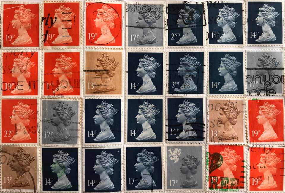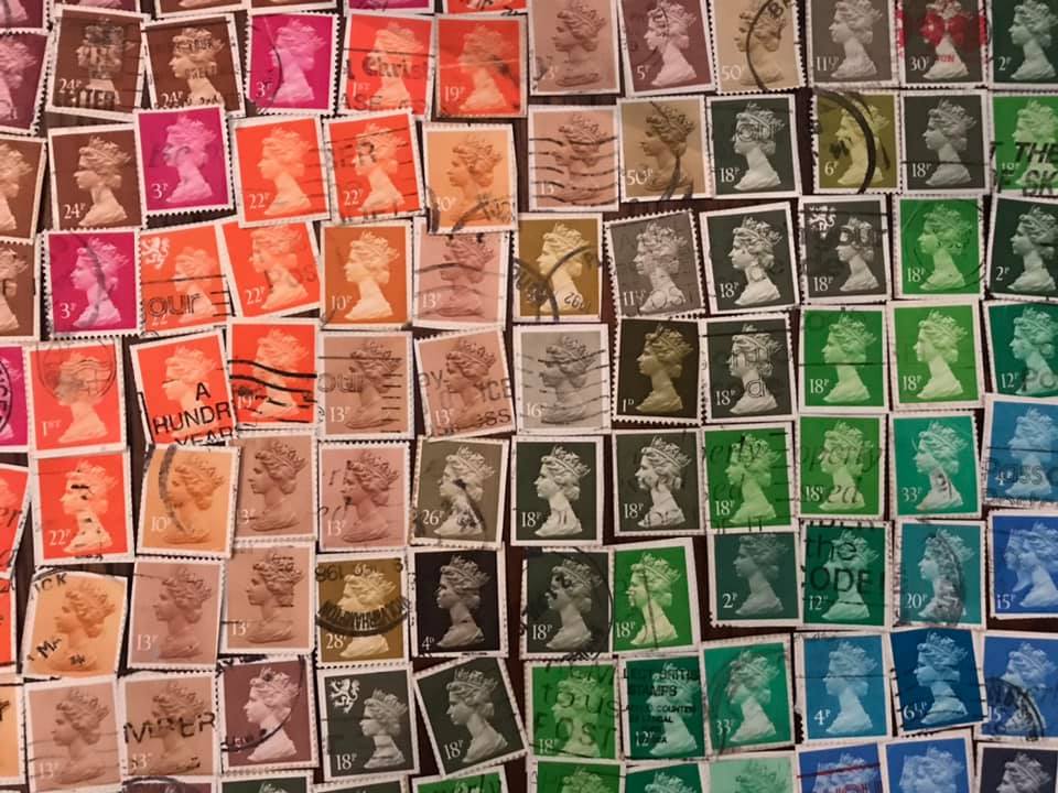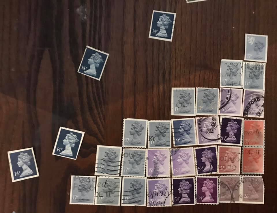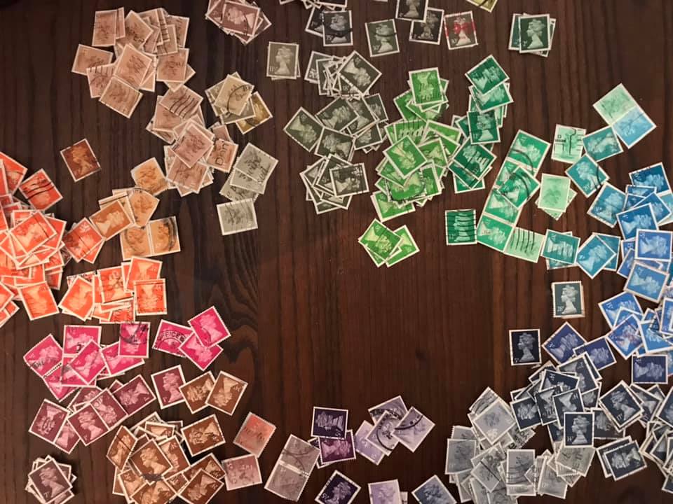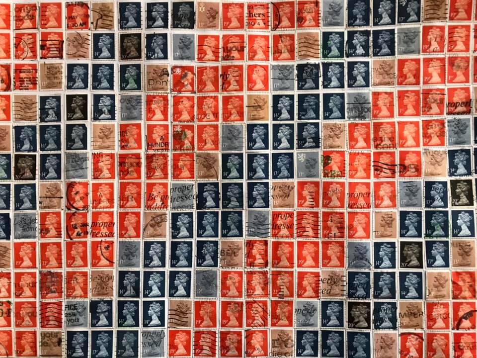 Stamp collection sorted by colourArranged in diagonal linesMore colours addedThe full collage laid outStamps glued onto cardFramed collageLots of blue and orange 1980s stamps left over, enough for a second collage!The colours go well together!Close up